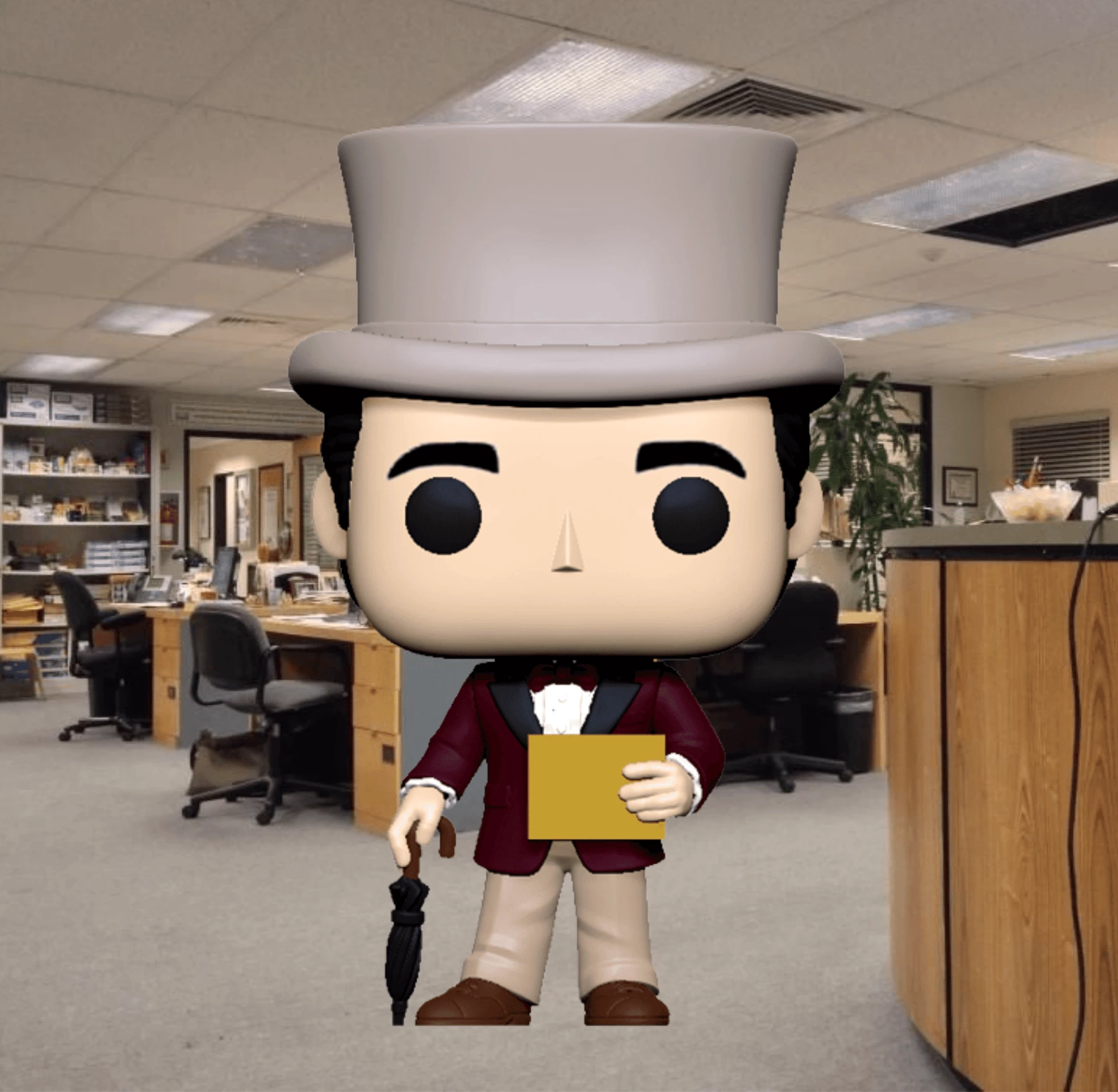 Collect your favorite television coworkers with this Pop! of Michael Scott dressed as Willy Wonka with Golden Ticket from The Office. Vinyl figure is approximately 4.5-inches tall.